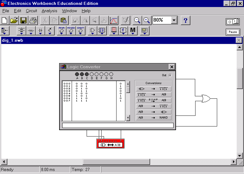 The logic converter can convert a digital circuit among different representations-truth table, Boolean expressions and circuit schematic. The logic converter icon looks like this: